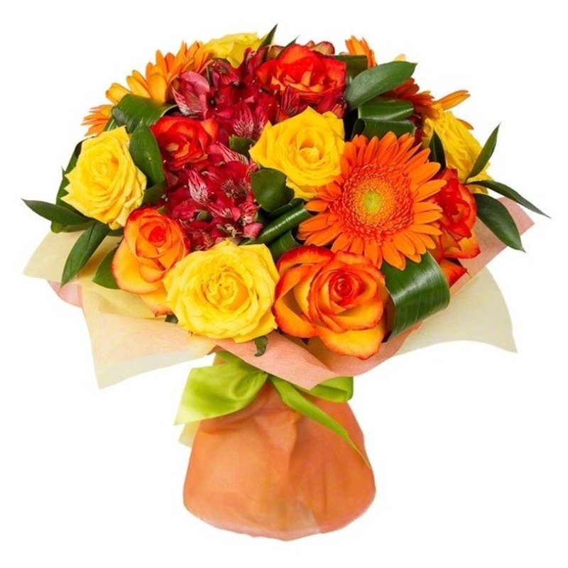 Букет состоит из 3 герберы, 11 роз, 5 альстромерий, аспидистра, рускус, красивая упаковка, атласная лента.