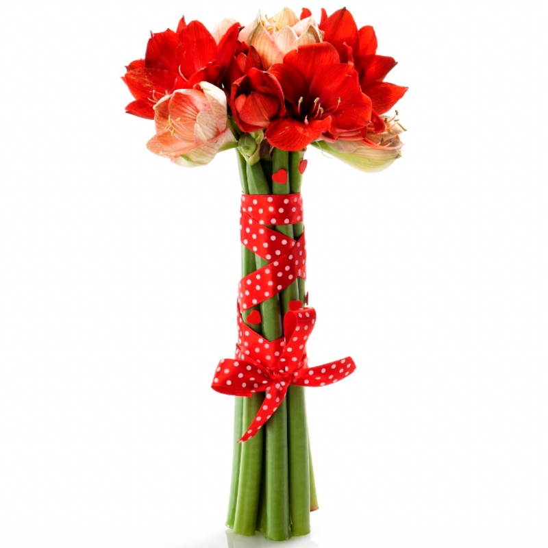 Букет состоит из MIX из 7 амариллисов, прозрачная упаковка, атласная лента.