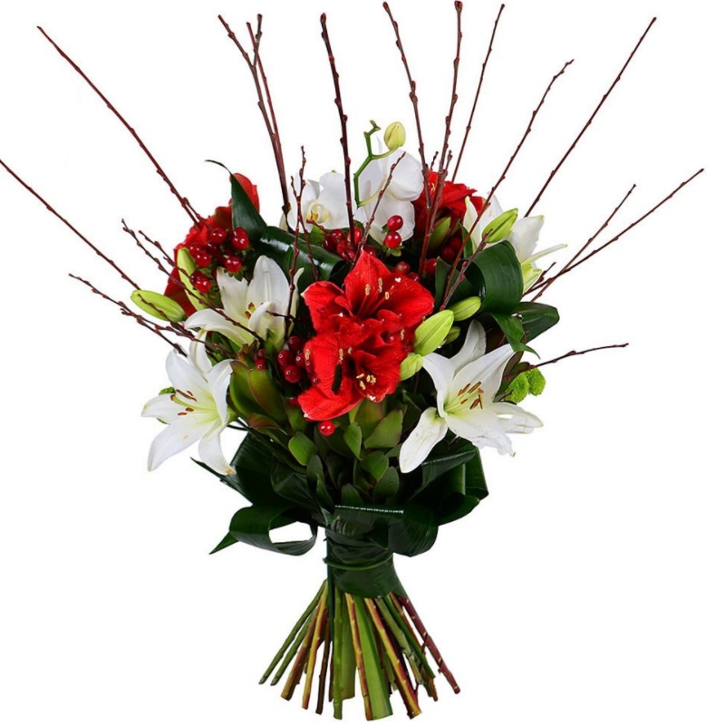 Букет состоит из 3 амариллиса, 3 лилии, 5 веток гиперикума, декоративные ветки, зелень, прозрачная упаковка, атласная лента.