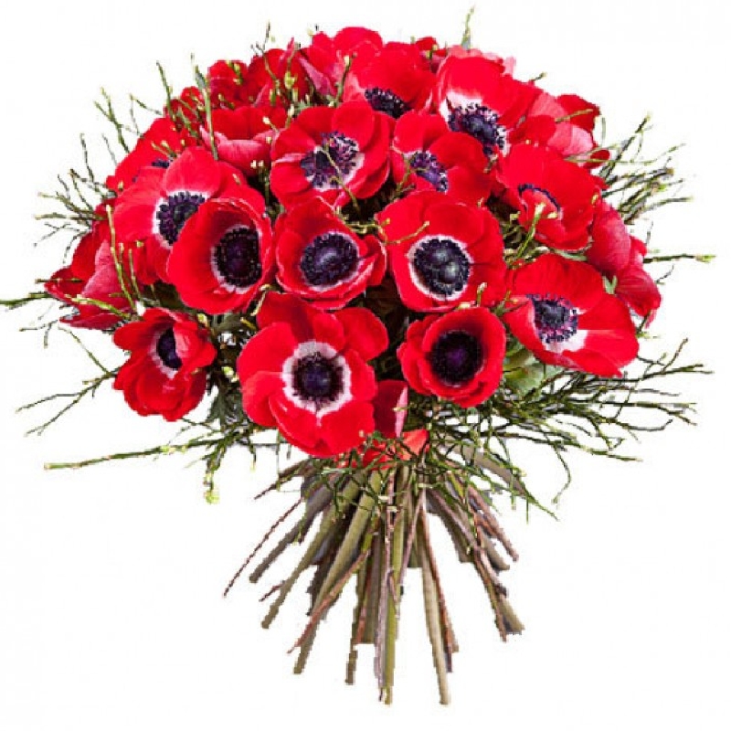 Букет состоит из 35 красных анемонов, зелень, прозрачная упаковка, атласная лента.