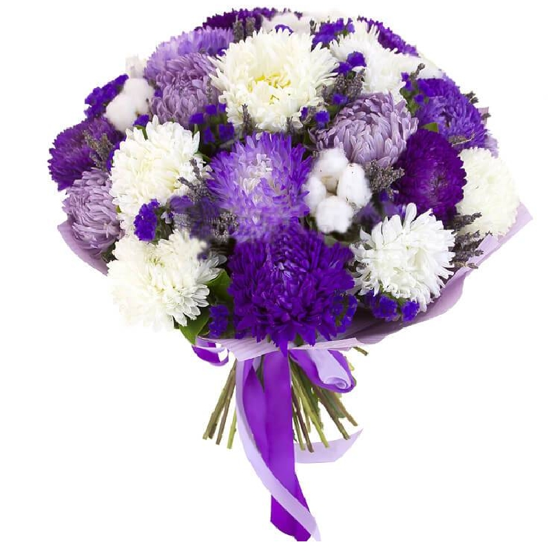 Букет состоит из MIX из 21 астры, 5 статица, хлопок, прозрачная упаковка, атласная лента.