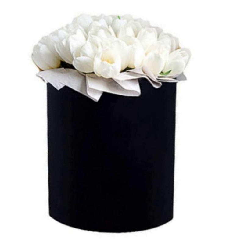 Букет состоит из 35 белых тюльпанов, коробка, оазис.