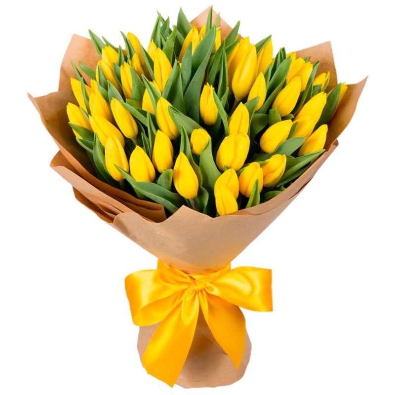 Букет состоит из 51 желтый тюльпан, крафт, атласная лента.