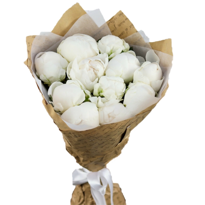 Букет состоит из 11 белых пионов, крафт, атласная лента.