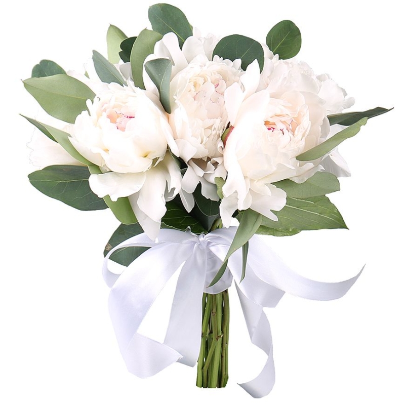 Букет состоит из 9 белых пионов, эвкалипт, прозрачная упаковка, атласная лента.