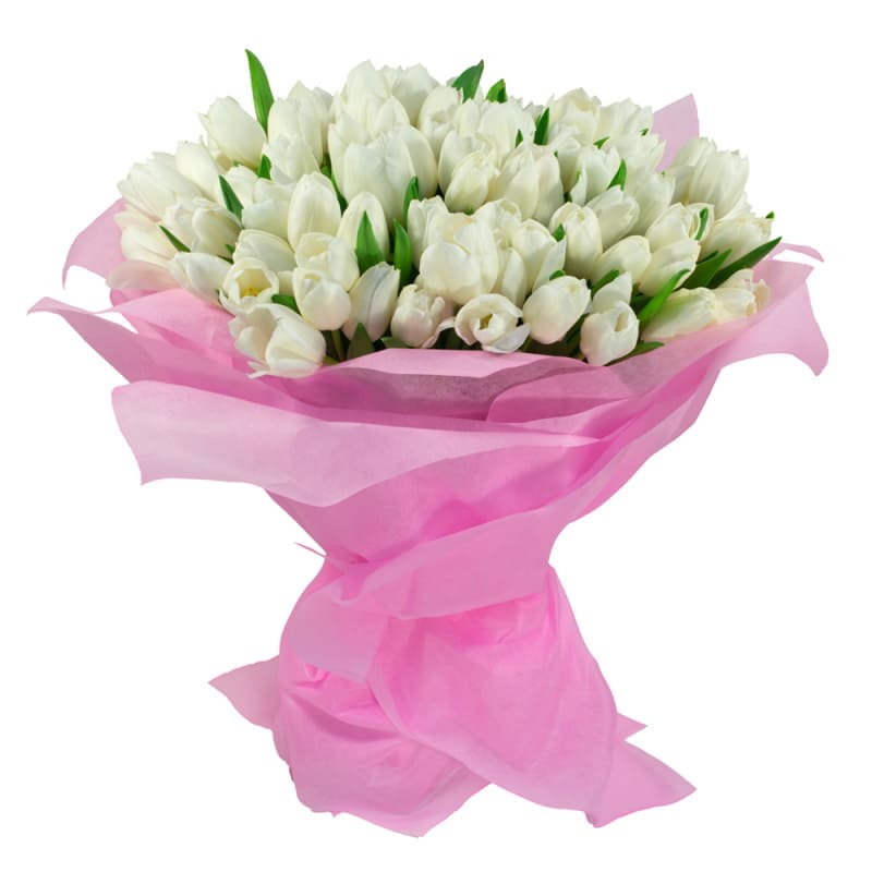 Букет состоит из 75 белых тюльпанов, розовая упаковка, атласная лента.