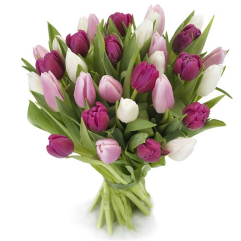 Букет состоит из MIX из 31 тюльпана, прозрачная упаковка, атласная лента.