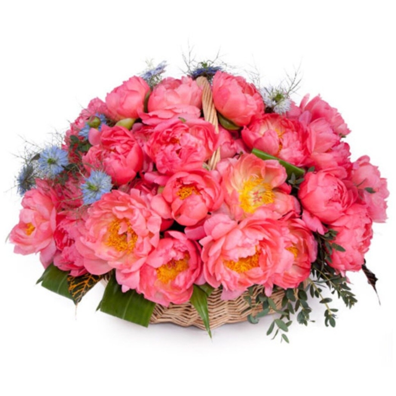 Корзина из 31 пиона с декоративной зеленью