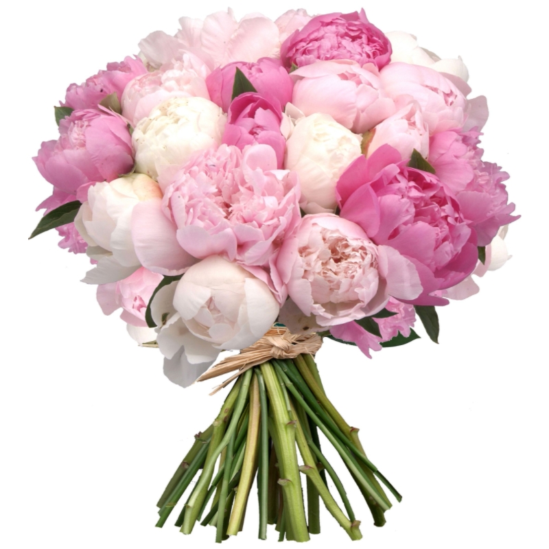 Букет состоит из 31 белый и розовый пион, прозрачная упаковка, лента.