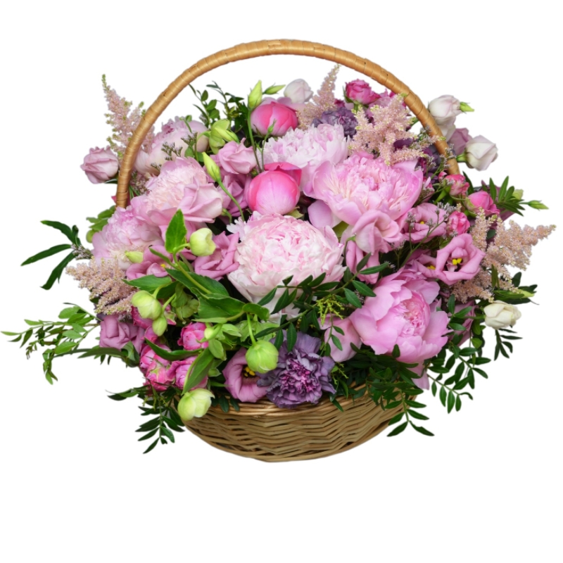 Букет состоит из 9 пионов, 6 пионовидных кустовых роз, 5 гвоздик, 7 веток эустомы, 7 астильба, зелень, корзина, оазис.