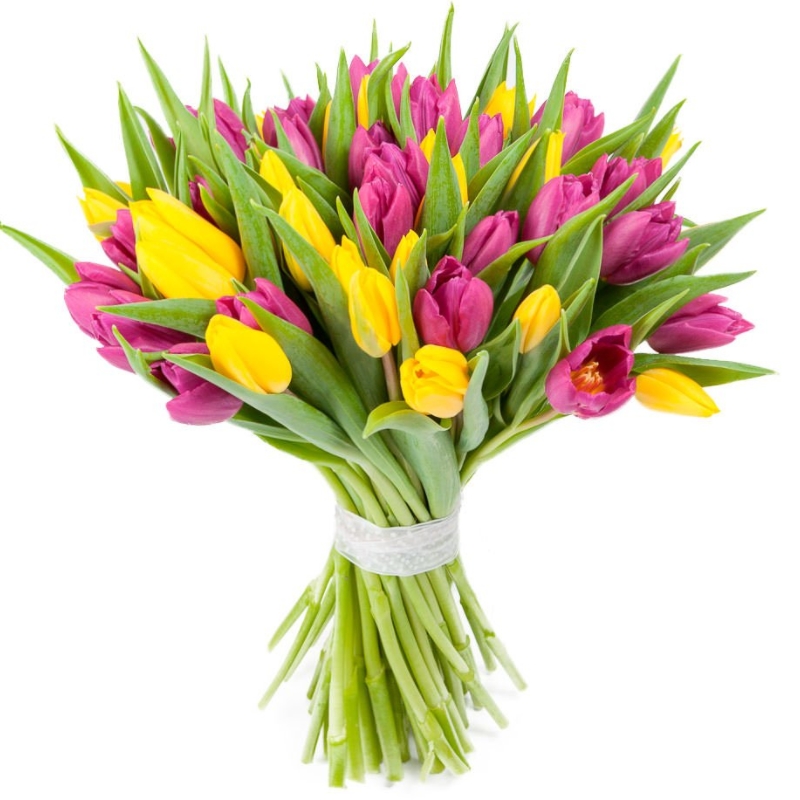 Букет состоит из 26 сиреневых тюльпанов, 25 желтых тюльпанов, прозрачная упаковка, атласная лента.