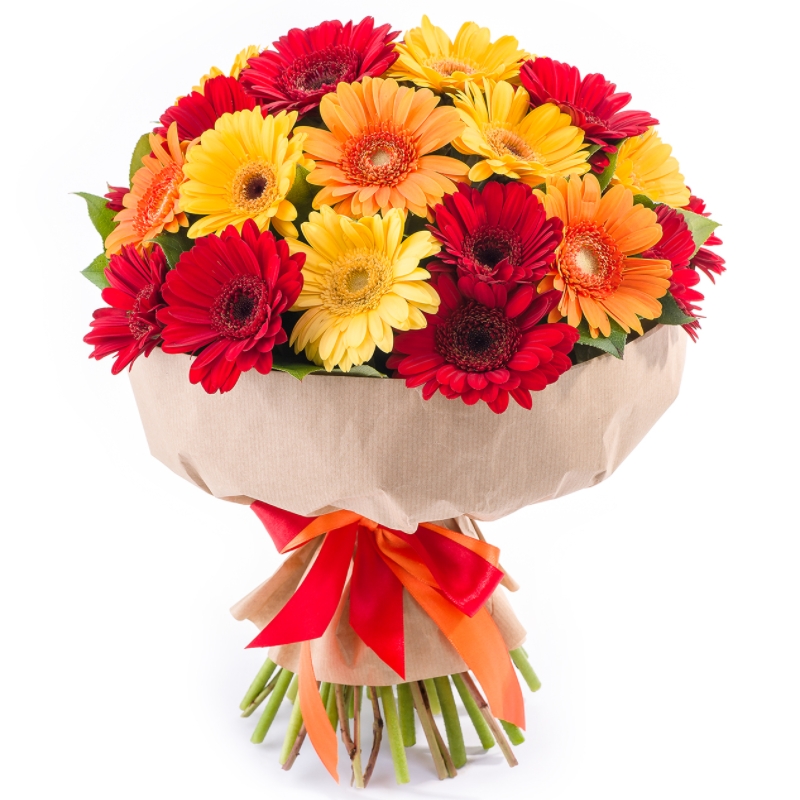 Букет состоит из MIX из 29 гербер, салал, крафт, атласная лента.