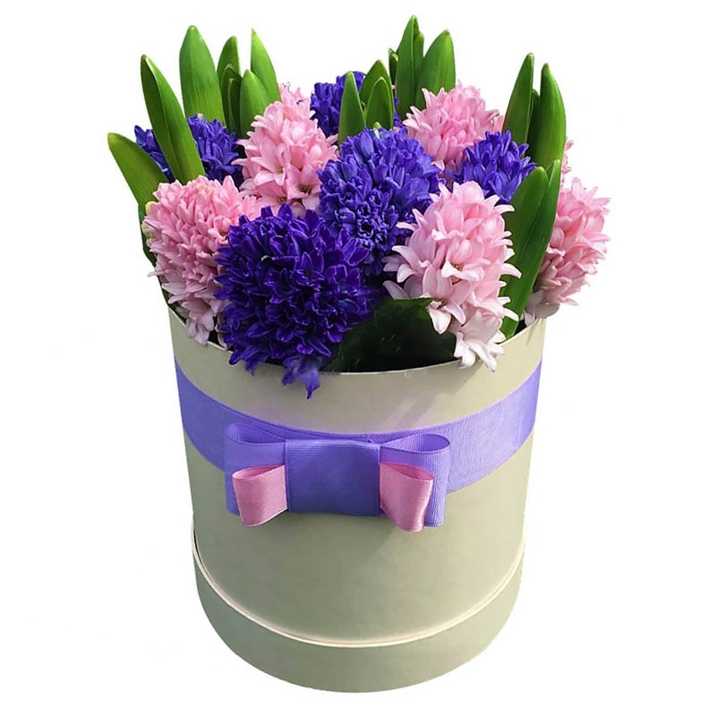 Букет состоит из 13 гиацинтов, коробка, оазис, атласная лента.