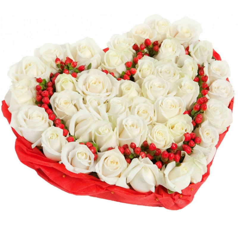 Композиция "Сердце" из 41 белой розы и гиперикума