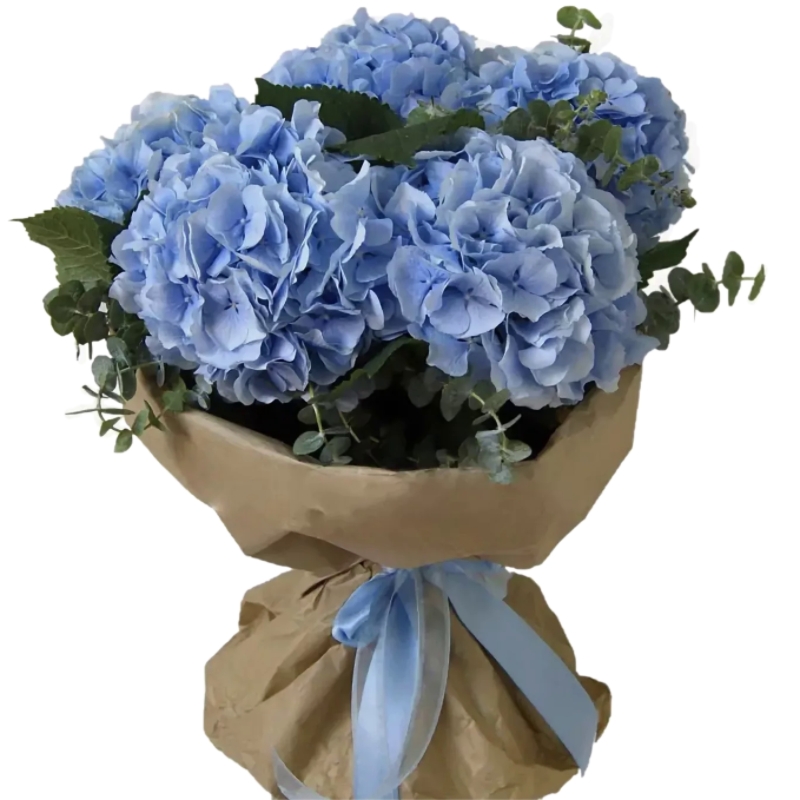Букет состоит из 5 синих гортензий, зелень, крафт, атласная лента.