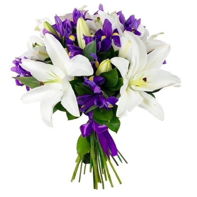 Букет состоит из 15 ирисов, 4 ветки белой лилии, рускус, прозрачная упаковка, атласная лента.