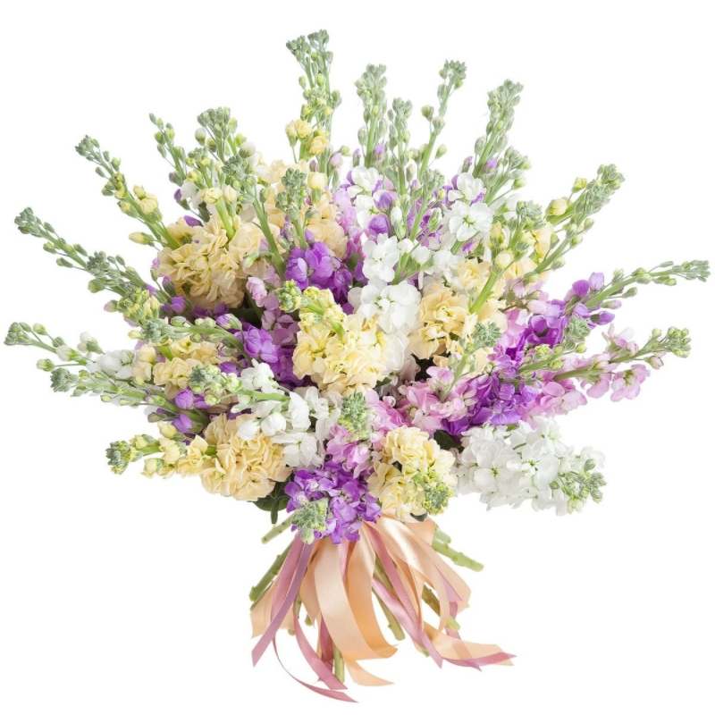 Букет состоит из MIX из 19 маттиол, прозрачная упаковка, атласная лента.