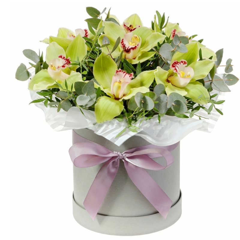 Букет состоит из 11 орхидей, зелень, коробка, оазис, атласная лента.