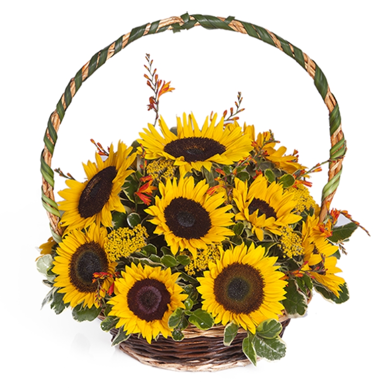 Букет состоит из 15 подсолнухов, декоративная зелень, корзина, оазис.