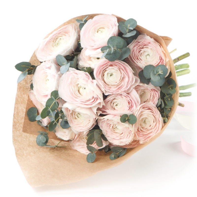 Букет состоит из 19 розовых ранункулюсов, крафт, атласная лента.