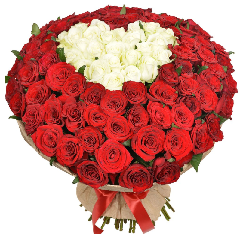 Букет состоит из 101 красная и белая роза, крафт, атласная лента.