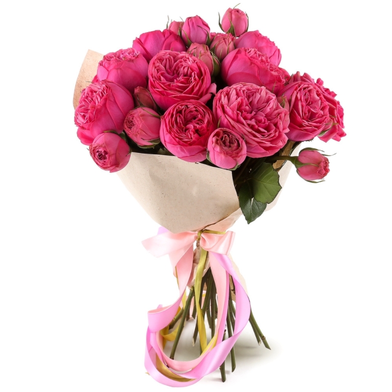 Букет состоит из 11 кустовых пионовидных роз, крафт, атласная лента.