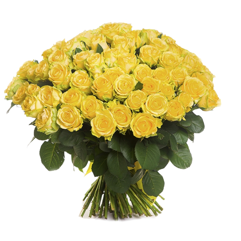 Букет состоит из 55 желтых роз, прозрачная упаковка, желтая лента.