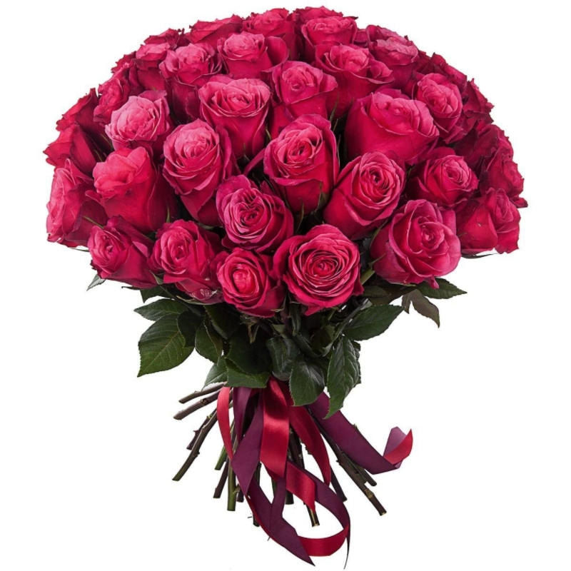 Букет состоит из 45 малиновых роз, прозрачная упаковка, атласная лента.