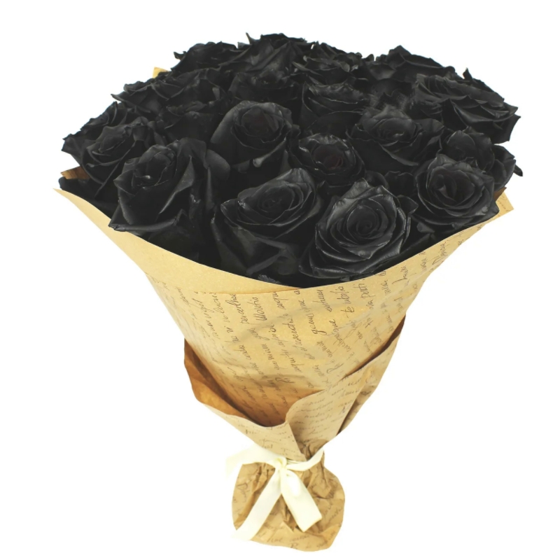 Букет состоит из 23 черные розы, крафт, атласная лента.