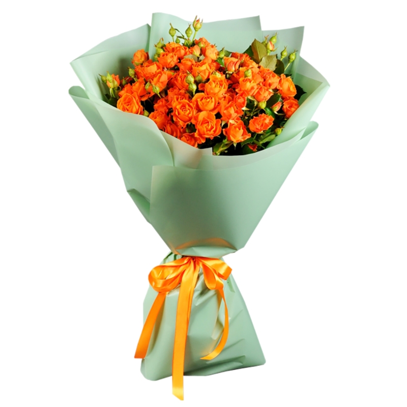 Букет состоит из 13 оранжевых кустовых роз, красивая упаковка, атласная лента.