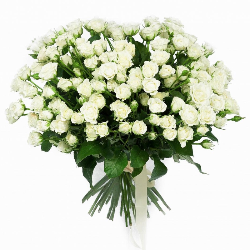 Букет состоит из 35 белых кустовых роз, прозрачная упаковка, атласная лента.