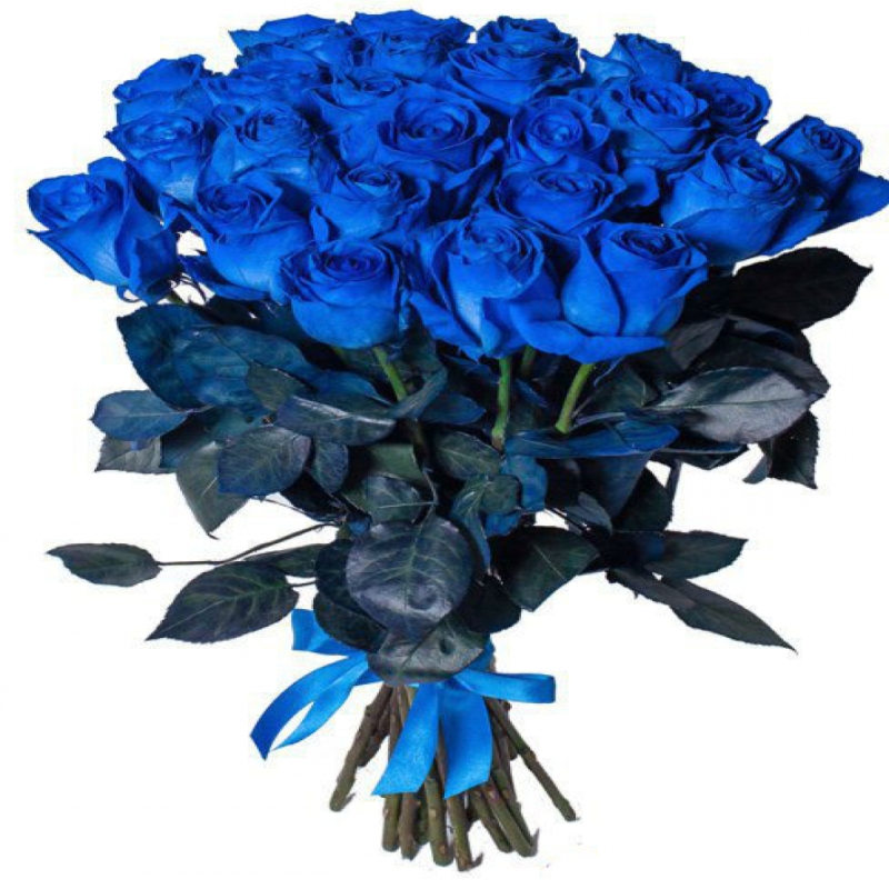 Букет состоит из 25 синих роз, прозрачная упаковка, атласная лента.